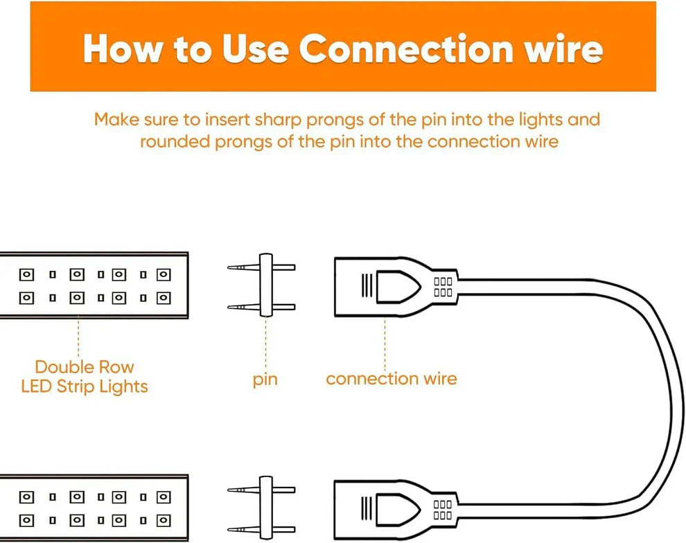 The kit includes everything needed for installation: two 3.28 ft (1 m) connection wires for flexible linking, one high-quality connector for power or strip-to-strip joining, ten durable 2-prong pins for firm electrical contact, and two rolls of heat-shrink tubing for long-lasting insulation.